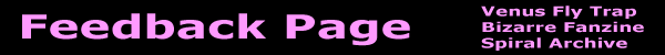 1. Please use the feedback form to send or request information about any part of this site. 2. Click on each check box to request any further information. 3. Please provide your email and snailmail address for correspondance. Venus Fly Trap Bizarre Fanzine Spiral Archive Alternatively, send an email to venus-fly-trap@lineone.net